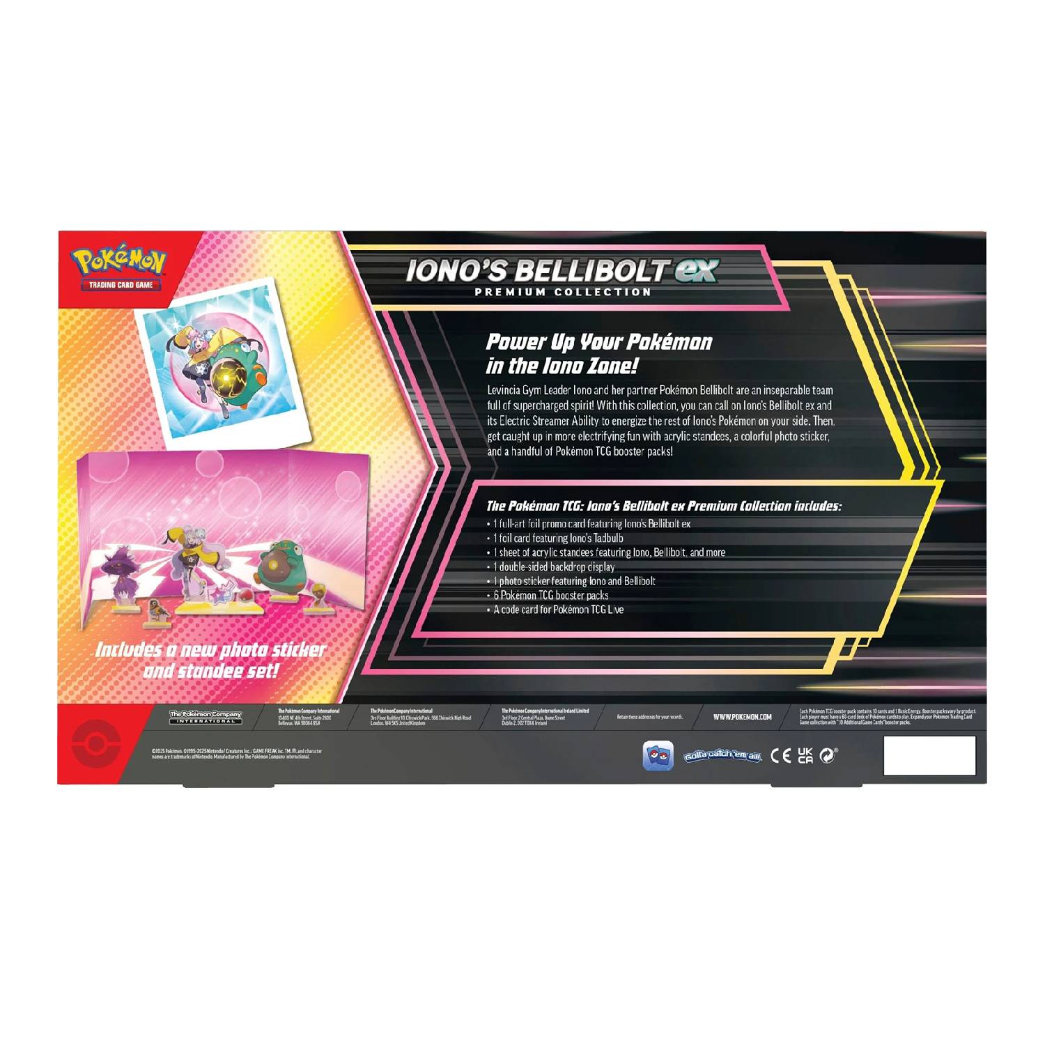 The Levincia Gym Leader, Iono, and her partner Pokémon Bellibolt make an energetic, inseparable team! With this collection, you can call upon Iono’s former Bellibolt and its Ability, Electro-Stream, to energize the rest of Iono’s Pokémon on your side. Then, unleash more electrifying fun with acrylic figures, a colorful photo sticker, and a handful of Pokémon TCG booster packs!